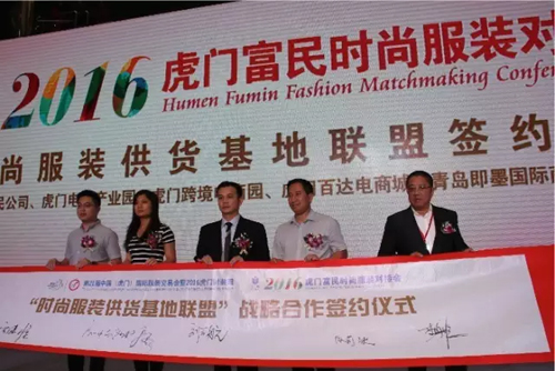 第21屆中國(虎門)國際服裝交易會暨2016虎門時裝周再度演繹了虎門服裝的錦繡繁華,期間的活動相當豐富,而18日舉行的“2016虎門富民時尚服裝對接會”無疑是重頭戲之一。 現場,中國紡織工業聯合會副會長楊紀朝,虎門鎮黨委副書記祁耀權,中國紡織工業聯合會流通分會副會長朱國學,廣東省服裝服飾行業協會會長卜曉強,廣東虎門集團總經理鄭慶疇、副總經理劉潔航等出席活動,此外還有來自廣東、山東、遼寧、北京、江西、湖南等地服裝服飾行業的領導和嘉賓。 對接會現場舉行了“時尚服裝供貨基地聯盟”簽約儀式。為加強合作交流,構建多贏平臺,富民時裝城重點打造了時尚服裝的供貨基地,與虎門電商產業園、中國郵政(虎門跨境電商園)、虎門百達電商城、青島即墨國際商貿城達成了“時尚服裝供貨基地聯盟”的戰略合作,并在現場舉行了簽約儀式。