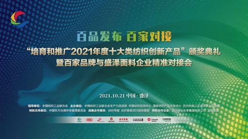10月21日,在第十屆江蘇(盛澤)紡織品博覽會盛大舉行之際,“百品發布·百家對接”——“培育和推廣2021年度十大類紡織創新產品”頒獎典禮暨百家品牌與盛澤面料企業精準對接會在江蘇省蘇州市吳江區盛澤鎮舉辦。