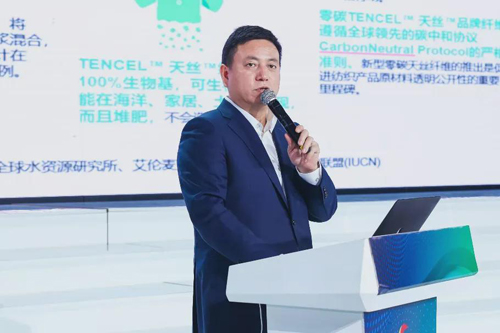 蘭精集團中國區紡織事業部高級商務總監戴富強以“推進‘雙碳’目標,助推品牌可持續發展”為主題,分享企業在推進“雙碳”工作方面的創新解決方案。他表示,蘭精集團提供的天絲TM品牌纖維可再生可降解,同時提供了節水節能,循環經濟等多個緯度的材料解決方案,最近更是推出了全球第一款零碳天絲TM纖維,為品牌向低碳、零碳方向邁進提供原料支持。