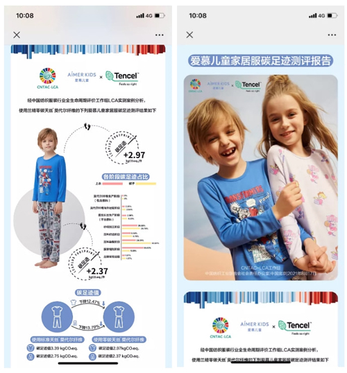 2021年4月7日,中國紡織工業聯合會社會責任辦公室主辦、德州華源生態科技有限公司承辦、愛慕集團和蘭精纖維上海有限公司協辦的“蘭精零碳莫代爾紗線碳中和訓練營”在德州華源成功舉辦。在活動上蘭精與各合作伙伴達成了共識,并和愛慕品牌共同制定了零碳產品開發的行動路線:開啟愛慕零售終端線上培訓,舉辦愛慕X零碳天絲?——鏈接環保產品和消費者快閃活動,提升品牌活動的媒體宣傳和曝光率。此外,蘭精還與愛慕股份旗下品牌進行線上互動以及推廣,例如:乎兮X環生纖?夏日限定線上發布、愛慕先生X天絲?地球日線上互動、愛慕先生X天絲?父親節線上聯合推廣。愛慕兒童家居服也加入碳足跡測評報告,每件男童家居服的碳足跡測算值為2.97kg CO2。