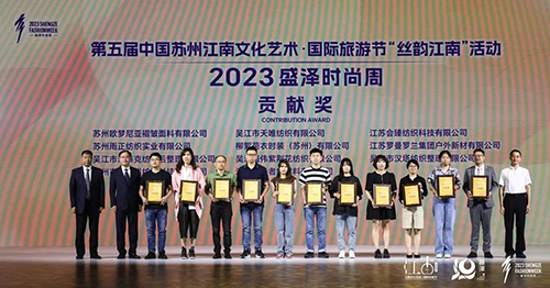 本屆時尚周期間,盛澤企業通過“原產、原創、綠色、時尚”的品牌面料奉獻了一場場精彩絕倫的風尚大典。為了向本屆時尚周作出貢獻的各界力量進行感謝,閉幕式現場舉行了隆重的頒獎儀式,現場揭曉2023盛澤時尚周貢獻獎、盛澤杯?2023江蘇省十佳服裝設計師評選優秀面料供應商等重量級獎項,眾多盛澤企業載譽而歸。