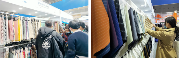 紹興杭亞織造有限公司主營各類衛衣面料、粗針面料,作為一家加工生產為一體的織造廠,具有從生產、設計到銷售等一條龍的全方面服務。據公司銷售主管鐘國英介紹,此次參展,公司共帶來300余款新款,主要以各類顏色豐富,后整理工藝特殊的衛衣面料和毛圈面料為主,展會現場有不少服裝品牌正在與其對接。“這是我們第6次參加上海展,但是第一次通過組團的方式參與。我感覺這種模式很好,在幫助我們節約參展成本的同時,展團形式參展規模大,引流效果好,現場對接下來的感覺也很好,在獲得意向訂單的同時,也幫助我們獲悉了客戶接下來的需求。”