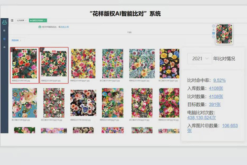 ![]() 據(jù)了解,花樣版權(quán)AI對比系統(tǒng)最多可同時進(jìn)行數(shù)十個以上的花樣的批量比對,并作出比對鑒定報(bào)告,讓信息技術(shù)精確甄別替代人工感官識別。該系統(tǒng)自全面投入運(yùn)行以來,已收錄浙江各地近10年登記的花樣版權(quán)圖案10.6萬件,入庫比對花型10706張,AI比對11.42億次,成功鑒定重復(fù)和抄版登記花樣1600余個,占比10.91%,其中異地重復(fù)登記占比8.46%,成功破解重復(fù)登記、盜仿登記的歷史難題。