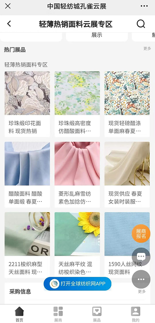 據了解,本次展會使用全球紡織網自行開發的“孔雀云展”線上直播平臺,此平臺與全球紡織網APP無縫銜接,功能集面料展示、在線詢盤、自主直播、多方群聊(視頻)、發布采購、精準匹配、在線引流、資源分享于一體,多維度提供沉浸式服務,給展商和觀眾極高的體驗感。