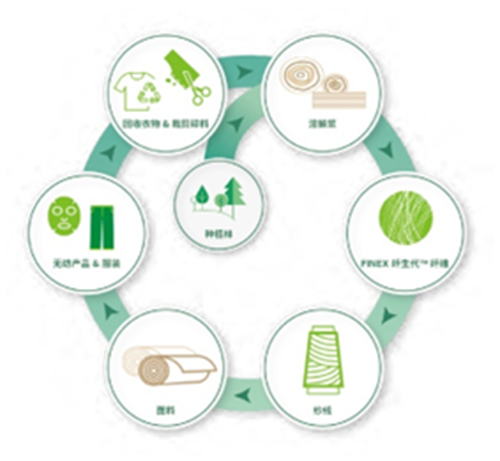 針對品牌對回收再造材料的需求,賽得利開發了FINEX纖生代??循環再生的纖維產品,利用諸如床品、T-shirt等消費后紡織廢料循環再生,實現了“資源-產品-消費-再生資源”的循環產業路徑。