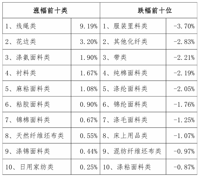據監測,本期服飾輔料類價格指數收報于130.62點,環比下跌0.21%,較年初下跌0.77%,同比下跌1.36%。其中:服裝里料類、帶類行情明顯下降,價格指數呈一定幅度下跌走勢。