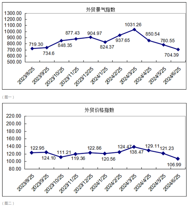 ![]() ![]() 如圖1、圖2所示,2024年6月份外貿景氣指數收704.39點,環比下跌9.76%;外貿價格指數收于106.99點,環比下跌11.75%;外貿信心指數收于1045.77點,環比下跌3.18%。