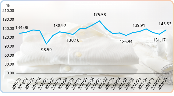 2024年三季度,柯橋時尚指數止跌攀升,收于145.33點,環比和同比分別上漲10.80%和3.87%,在彌補上半年指數跌幅基礎上實現進一步回升,高于一季度的指數水平。