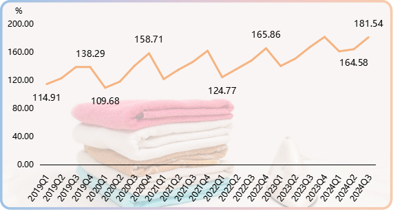 2024年三季度,在新花型推出數強勢增長的帶動下,時尚創意指數扭轉跌勢,低位抬升,收于161.65點,環比漲幅33.75%。