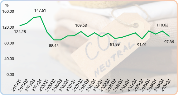 2024年三季度,時尚推廣度指數收于97.86點,環比有所下滑,但同比上漲7.53%,顯示出柯橋時尚產業推廣水平盡管短期內面臨波動,但仍有所提升。