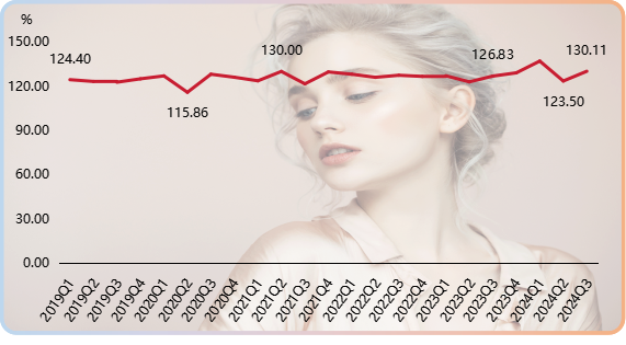 2024年三季度,時尚評價指數止跌上揚,收于130.11點,環比和同比分別上漲5.35%和2.59%。時尚評價指數自2023年三季度開始向上爬升,截至今年一季度已實現連續三個季度的上漲,二季度指數有所回調,三季度再度攀升至較高水平運行。