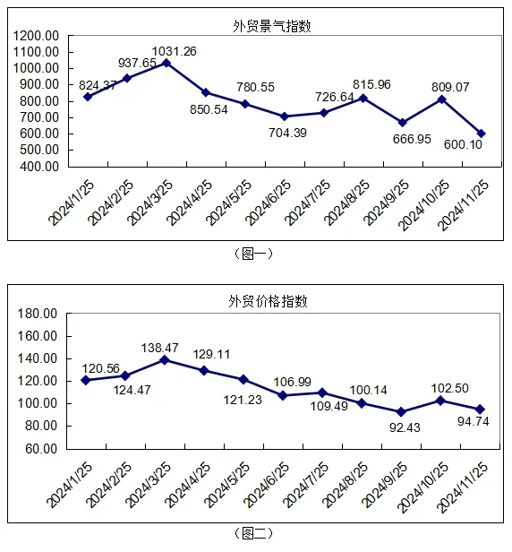 ![]() ![]() 如圖1、圖2所示,2024年11月份外貿景氣指數收600.01點,環比下跌25.83%;外貿價格指數收于94.74點,環比下跌7.57%;外貿信心指數收于997.12點,環比下跌9.89%。
