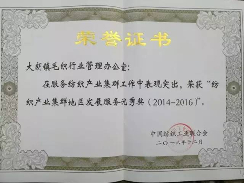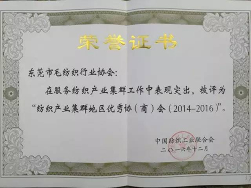 東莞市毛紡織行業協秘書長陳春暖代表毛織協會接受“紡織產業集群地區優秀協會”證書。 2002年12月,中國紡織工業聯合會把大朗等全國38個市(縣、區)、鎮列為中國紡織工業聯合會首批產業集群試點地區,并授予大朗“中國羊毛衫名鎮”稱號。 多年來,大朗積極配合聯合會做好調研統計等工作,參加聯合會的各項會議;分別于是2010年和2013年順利通過聯合會對“中國羊毛衫名鎮”稱號的兩次復評;并于2012年產業集群十年工作會議上被授予“全國紡織模范產業集群”,2013年被授予“全國紡織行業先進黨建工作示范單位”和“紡織產業集群地區發展服務榮譽獎”稱號,多次被評為“紡織行業統計工作優秀集體”。 |