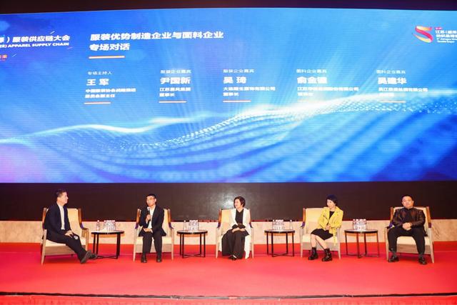 在服裝優(yōu)勢(shì)制造企業(yè)與面料企業(yè)嘉賓對(duì)話專場,江蘇晨風(fēng)集團(tuán)董事長尹國新、大連隆生服飾有限公司董事長吳琦與江蘇華佳絲綢股份有限公司董事長俞金鍵、吳江鼎盛絲綢有限公司總經(jīng)理吳建華展開交流討論。