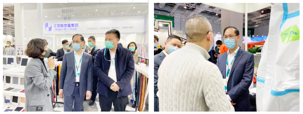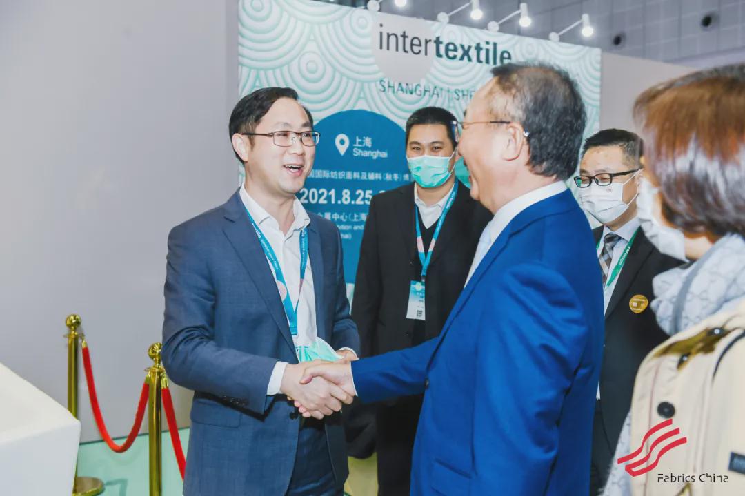 在展會上,中國紡織工業聯合會會長孫瑞哲會見了吳江區人民政府黨組成員、吳江高新區黨工委書記、盛澤鎮黨委書記沈春榮一行。雙方還分別現場巡館,與盛澤紡企、采購商交流。吳江高新區管委會副主任、盛澤鎮黨委副書記、 中國東方絲綢市場管委會主任張建華參加活動。