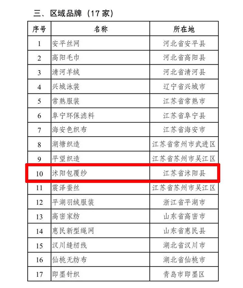 ![]() 其中,消費品牌53家制造品牌54家,區域品牌17家,沭陽包覆紗入選“區域品牌”名單。