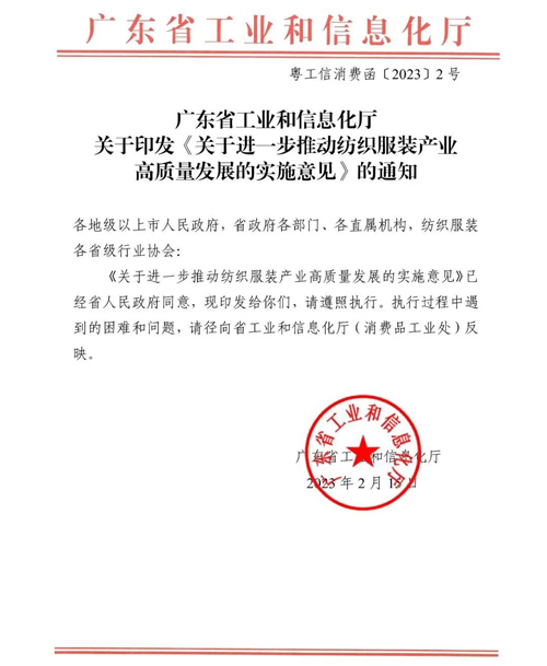 近日,廣東省工業和信息化廳發布《關于進一步推動紡織服裝產業高質量發展的實施意見》,進一步落實省實施制造業當家的戰略部署,強調目標并列出實施意見。到 2025 年底,爭取紡織和服裝產業營收達到 7000 億元,到 2027 年實現翻一番。