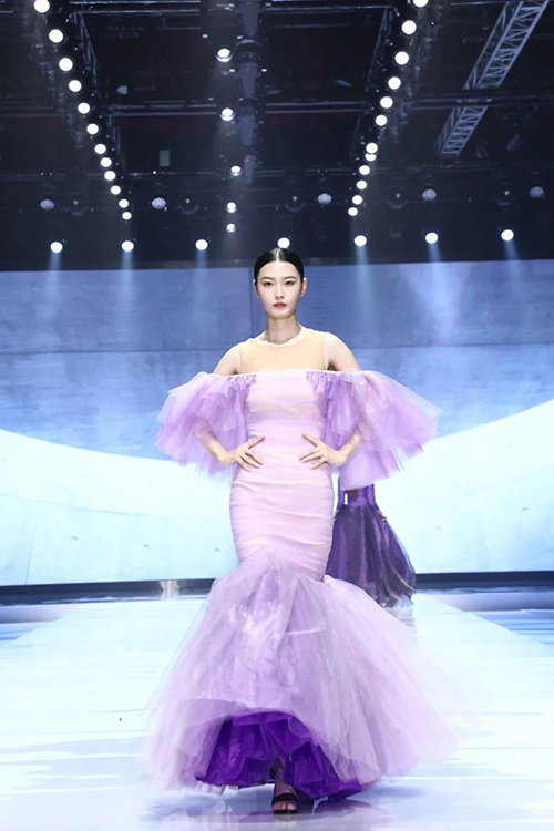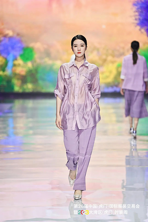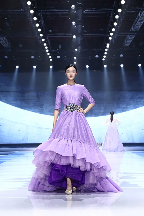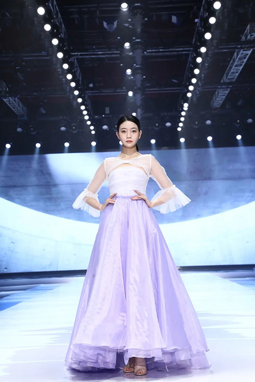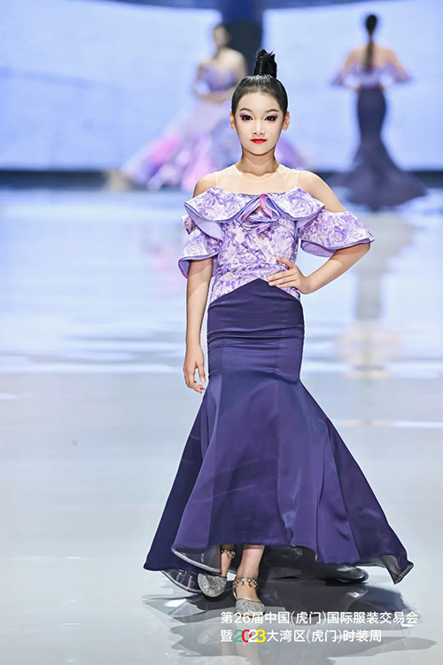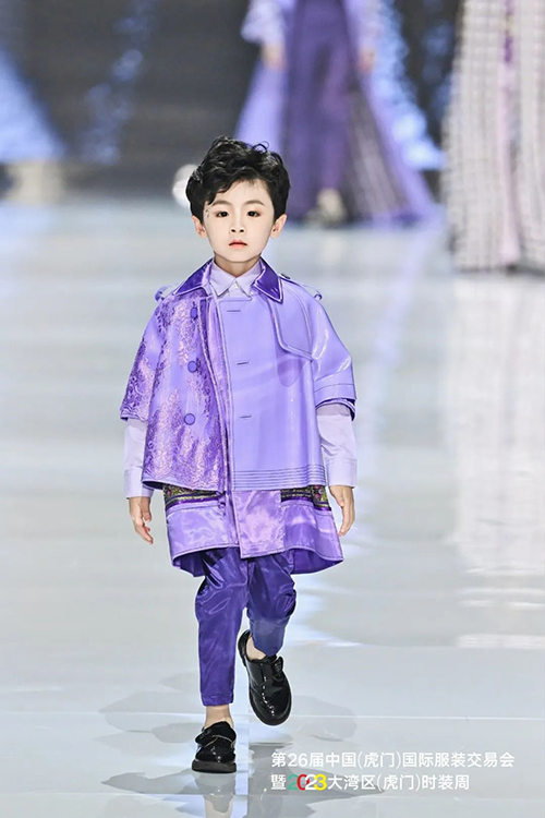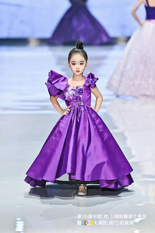 中國十佳童裝設(shè)計師、廣東省十佳服裝設(shè)計師、富民首席服裝設(shè)計師——馮璐表示,以莫奈為代表的印象派畫家曾經(jīng)深深地迷戀紫色,莫奈對光影與色彩進行了深入研究,常大膽地以紫色作為主色調(diào)來創(chuàng)作,因此針對本季作品的流行趨勢,在色調(diào)方面,迷人又治愈的紫色自然成為最佳選擇,相信紫色作為金色陽光的互補色,能更好地表現(xiàn)光影的維度,使得作品與身體與環(huán)境更加具有強大的生命力。這次展示的作品在細節(jié)趨勢、面料趨勢和工藝趨勢方面,較以往都有很大的突破。