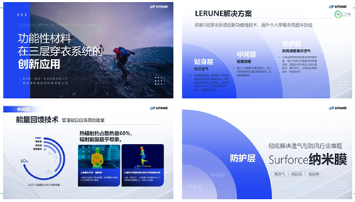 ![]() 聯潤翔集團成立于2003年,專注功能材料20年。姜露這次重點介紹了“三層穿衣系統”。這里的“三層”并非指“三件”衣服,而是用多件衣服構建外層、中間層和貼身層三個層次。通過衣服分層疊加,為身體提供可靠的天氣防護,保持穿著舒適及安全,并確保行動自如。這次她帶來的盛雅祺“LERUNE解決方案”,依據三層穿衣系統創新功能性技術,提升個人穿著系統整體舒適:貼身層排汗透氣;中間層輕便保暖;外層防風保暖兼并透氣,其三層穿衣系統很好地兼顧了這三種需求。