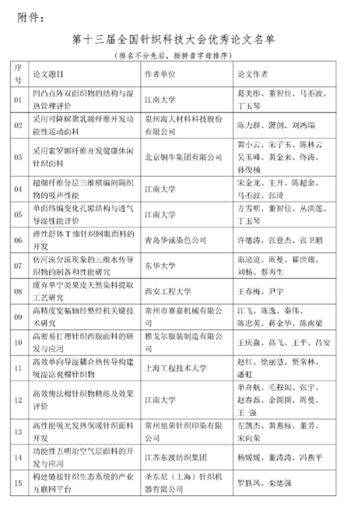 中國針織工業(yè)協(xié)會副會長李紅宣讀了“關(guān)于表彰第十三屆全國針織科技大會優(yōu)秀論文的決定”,《凹凸點陣雙面織物的結(jié)構(gòu)與濕熱管理評價》等 45 篇論文獲評第十三屆全國針織科技大會優(yōu)秀論文(名單見文末附件1),中國針織工業(yè)協(xié)會專家技術(shù)委員會主任瞿靜、常務(wù)副主任楊啟東頒發(fā)了證書。