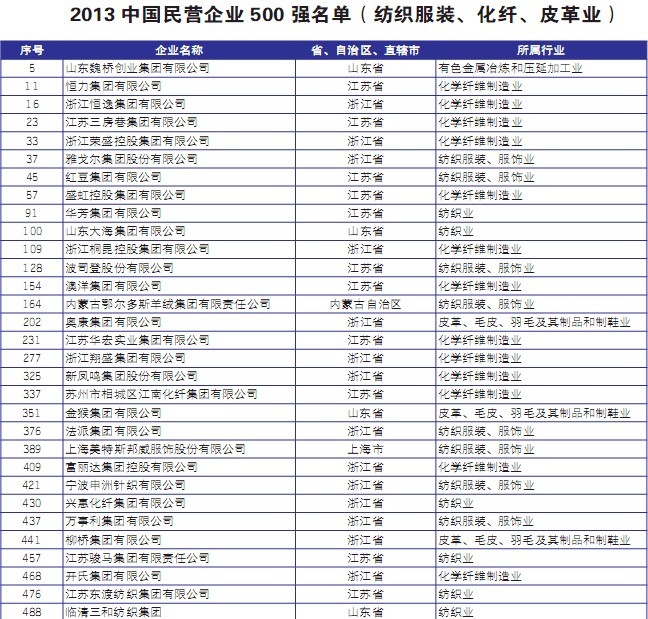 在2013中國民營企業(yè)500強榜單中,恒力集團有限公司、浙江恒逸集團有限公司、江蘇三房巷集團有限公司、浙江榮盛控股集團有限公司、雅戈爾集團股份有限公司、紅豆集團有限公司等共有31家紡織服裝企業(yè)入選,而位居前50位的企業(yè)中,紡織服裝企業(yè)占據(jù)了7家。它們在當前的新形勢下,銳意進取,砥礪奮進,為行業(yè)的發(fā)展貢獻著自己的熱情和力量。