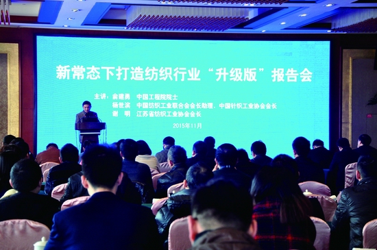 11月27日,新常態下打造紡織行業“升級版”報告會在江蘇張家港舉行。中國工程院院士、東華大學教授俞建勇,中國紡織工業聯合會會長助理、中國針織工業協會會長楊世濱,江蘇省紡織工業協會會長謝明做了專題報告。張家港市經信委、發改委、質監局、民政局、工經聯等部門領導、各相關鄉鎮產業負責人及120多家紡織服裝企業的負責人出席會議。