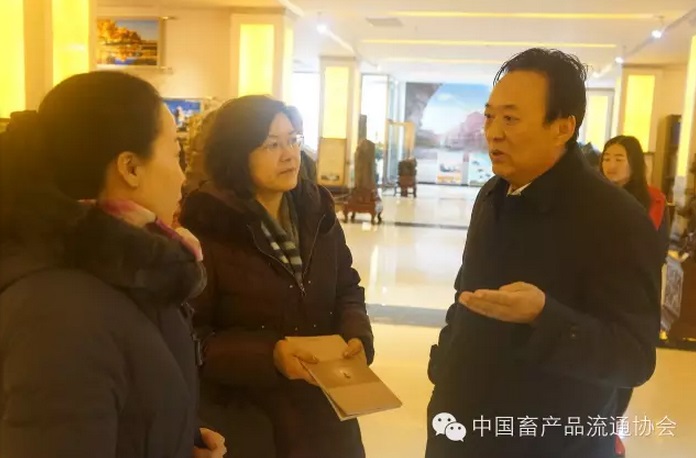 中國畜產品流通協會常務副會長倪靜(左二)與阿拉善盟左旗駝中王絨毛制品有限公司董事長李志善就駝絨產業發展的問題進行交流。 |