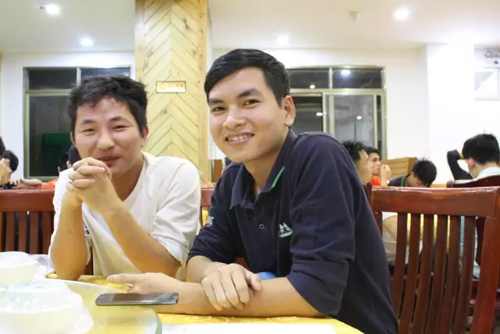 左:天虹紡織中越語言翻譯李盛庭,右:越南大學生Tr?nh C?ng S?n/鄭功山 此次越南大學生團隊出境到中國學習,因語言的障礙、生活習慣的不同、以及考慮到安全因素,天虹紡織沒少下功夫,還專門聘請了兩名中越語言翻譯人員全程陪同參與。李盛庭(26歲的廣西小伙,天虹紡織員工,主職中越語言翻譯)在聊天中欣慰地提到,“所有的越南大學生都非常珍惜此次來到恒天立信的培訓機會,在學習中能專心致志,善于提問,有他們獨特的探討問題和解決問題的思維方式,他們對技術問答都做了大量的筆記,準備回國在工作中實踐使用。 |