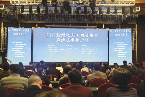 2017紡織之光“白鯊境泉”麻紡技術推廣會舉行 本刊記者-徐盼盼 近年來麻類產品呈現出爆發性增長,同時麻紡行業的發展也面臨著一系列問題:麻產品的生產存在勞動強度大、機械化水平低、加工技術落后等瓶頸;西方市場很重視麻紡產業的發展,而國內市場還有待于進一步的開發。同行之間的相互交流溝通,有利于打破行業間的技術壁壘,也給與會企業帶來了更多的思路與啟發。 12月13日,由中國麻紡織行業協會、紡織之光科技教育基金會、中國紡織工業聯合會科技發展部聯合主辦,光山白鯊針布有限公司支持,孫吳縣人民政府、立信染整機械(深圳)有限公司、咸寧市咸安區人民政府、湖北精華紡織集團有限公司協辦的2017紡織之光“白鯊境泉”麻紡技術推廣會在湖北咸寧順利召開。中國麻紡織行業協會會長董春興、中共咸寧市咸安區區委常委施繼武、紡織之光科技教育基金會秘書長張翠竹、孫吳縣人民政府副縣長徐永新等相關協會與地區領導,以及來自麻紡織行業的技術及管理人員,相關紡織企業、高校、科研機構、麻類植物種植加工企業技術人員約200人出席了此次推廣會,就如何推動麻紡行業科技成果轉化、推動麻紡產業技術進步、搭建行業新技術交流平臺等問題展開了深入探討。