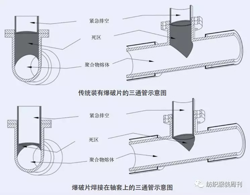 根據(jù)上圖所示,爆破片被焊接在軸套上從而減小死區(qū)面積,但這并不意味著死區(qū)被徹底消除。與爆破片相比,ONE-A卸壓閥的密封組件能被不斷清洗。由此,為了抑制聚合物熔體的沉淀和結塊,管道內壁和密封組件的過渡區(qū)就不會有圓角和邊緣。