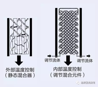 二是混合元件。在特別優(yōu)選的實(shí)施方案中,根據(jù)ONE-A的系統(tǒng),熱交換器管道系統(tǒng)包含內(nèi)部的混合組件,至少一段管道或熱交換器。 一種可行的方法為安裝內(nèi)部混合組件,與在雙層夾套聚合物管道殼體內(nèi)的外部冷卻(或調(diào)節(jié))相結(jié)合。混合組件被用來(lái)旋動(dòng)流體以此使層流轉(zhuǎn)變?yōu)橥牧鞑ⅲɑ颍臒峤粨Q器中心到截面的外部區(qū)域形成一個(gè)流體交換。熱交換僅發(fā)生在(冷卻的)管壁和與(冷卻的)管壁臨時(shí)直接接觸的打旋的聚合物之間。 混合組件也可以部分或獨(dú)立的熱交換器形式提供,帶有內(nèi)部混合和內(nèi)部溫度控制。 根據(jù)實(shí)例,與熱交換器管道系統(tǒng)相關(guān)的發(fā)明,是一個(gè)混合組件與溫度控制方式的結(jié)合,譬如,以在熱交換器內(nèi)部的傳熱介質(zhì)管道的形式。這可以通過(guò)對(duì)一個(gè)傳熱介質(zhì)管道進(jìn)行相應(yīng)形狀的纏繞實(shí)現(xiàn)。為了防止壓力損失產(chǎn)生的摩擦熱,傾向于選擇較低的填料密度。