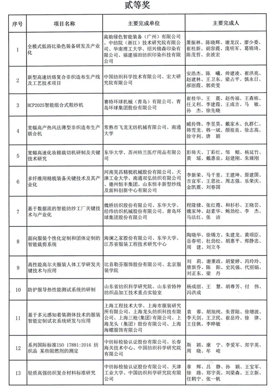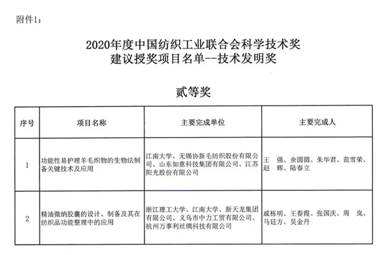 中國紡織工業聯合會 科學技術獎勵辦公室公告 2020年度中國紡織工業聯合會科學技術獎(技術獎)初評、復評工作已經結束。根據《中國紡織工業聯合會科學技術獎勵辦法實施細則》的規定,現將紡織科技獎評審委員會建議授獎的項目進行公示。 自本公告公布之日起20日內,任何單位或個人對公布項目持有異議,可以書面方式向我辦提出,并提供必要的證明材料。為便于核實查證,確保客觀公正處理異議,提出異議的單位或個人應當表明真實身份,并提供有效聯系方式。以單位名義提出異議的,須在書面異議材料上加蓋本單位公章;個人提出異議的,須簽署真實姓名。我辦將按有關規定對其身份予以保護。超出期限的異議不予受理。 原2020年9月27日中紡聯獎辦[2020]6號公告因附件有誤作廢,以本公告為準。 聯系方式:中國紡織工業聯合會科技獎勵辦公室, 北京市朝陽區朝陽門北大街18號803房間 郵編100020。 附件: 1、2020年度中國紡織工業聯合會科學技術獎建議授獎項目名單——技術發明獎 2、2020年度中國紡織工業聯合會科學技術獎建議授獎項目名單——科技進步獎 2020年9月28日 附件1