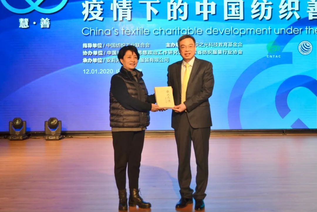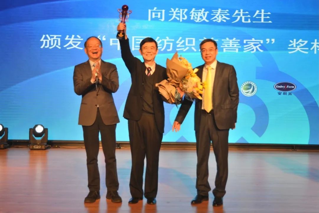 本次論壇特別向紡織之光基金會捐贈超過1000萬元以上的大額捐贈人——安莉芳集團創始人鄭敏泰頒發“中國紡織慈善家”榮譽獎杯,以感謝鄭敏泰對中國紡織服裝行業科教事業做出的突出貢獻。鄭敏泰通過視頻發表感言。