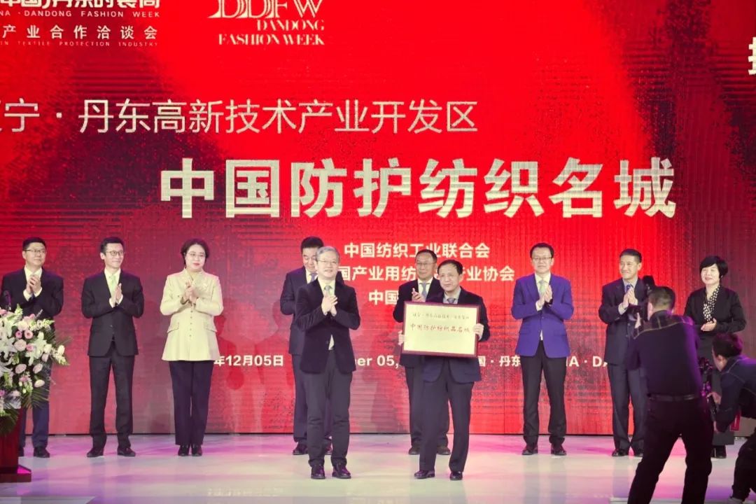 與會(huì)領(lǐng)導(dǎo)為遼寧?丹東高新技術(shù)產(chǎn)業(yè)開(kāi)發(fā)區(qū)頒發(fā)了“中國(guó)防護(hù)紡織名城”牌匾。 今年,是丹東紡織服裝行業(yè)突破性發(fā)展的一年,不僅為國(guó)內(nèi)外抗擊疫情提供了物質(zhì)保障,也為丹東、為遼寧經(jīng)濟(jì)建設(shè)做出重大貢獻(xiàn)。