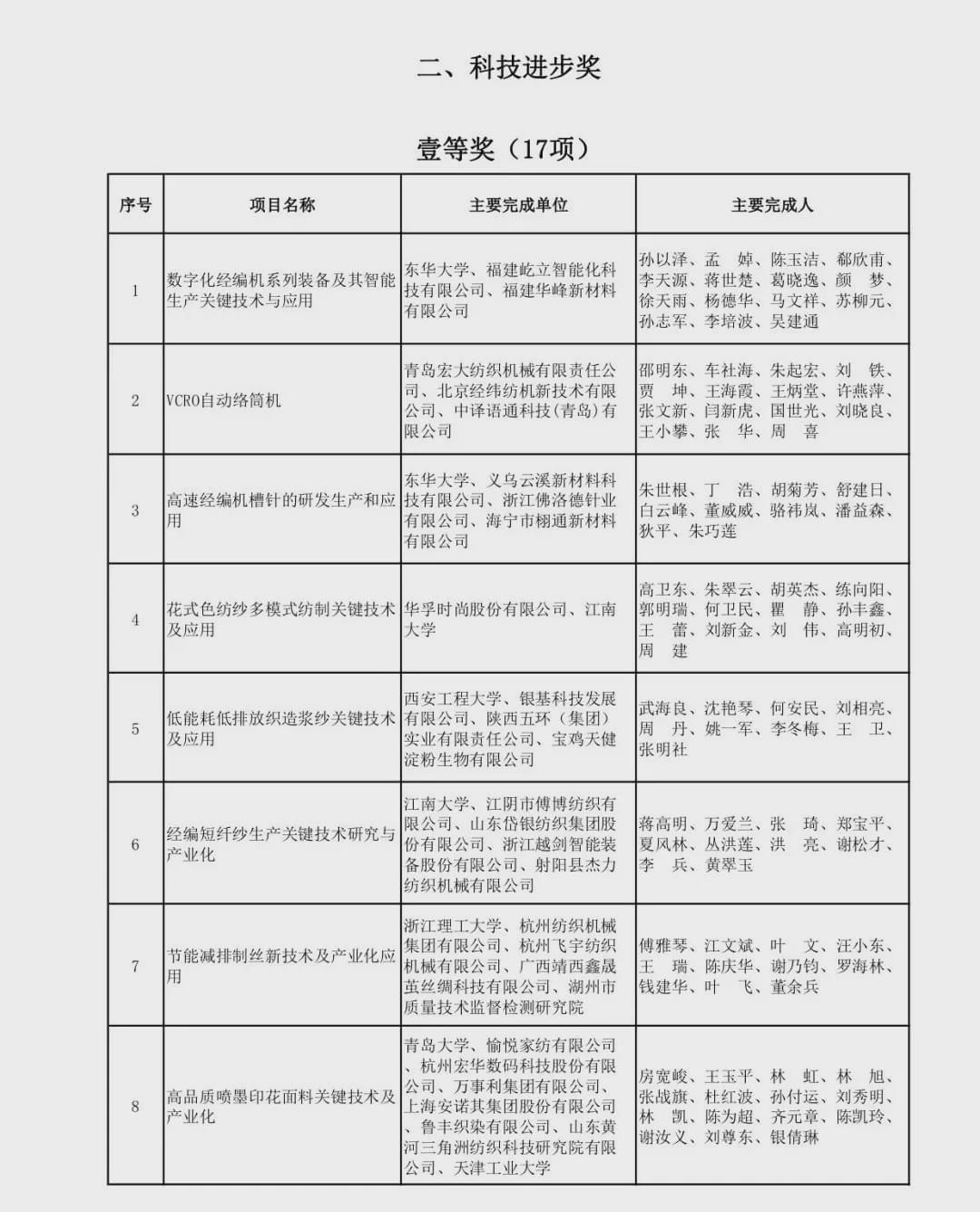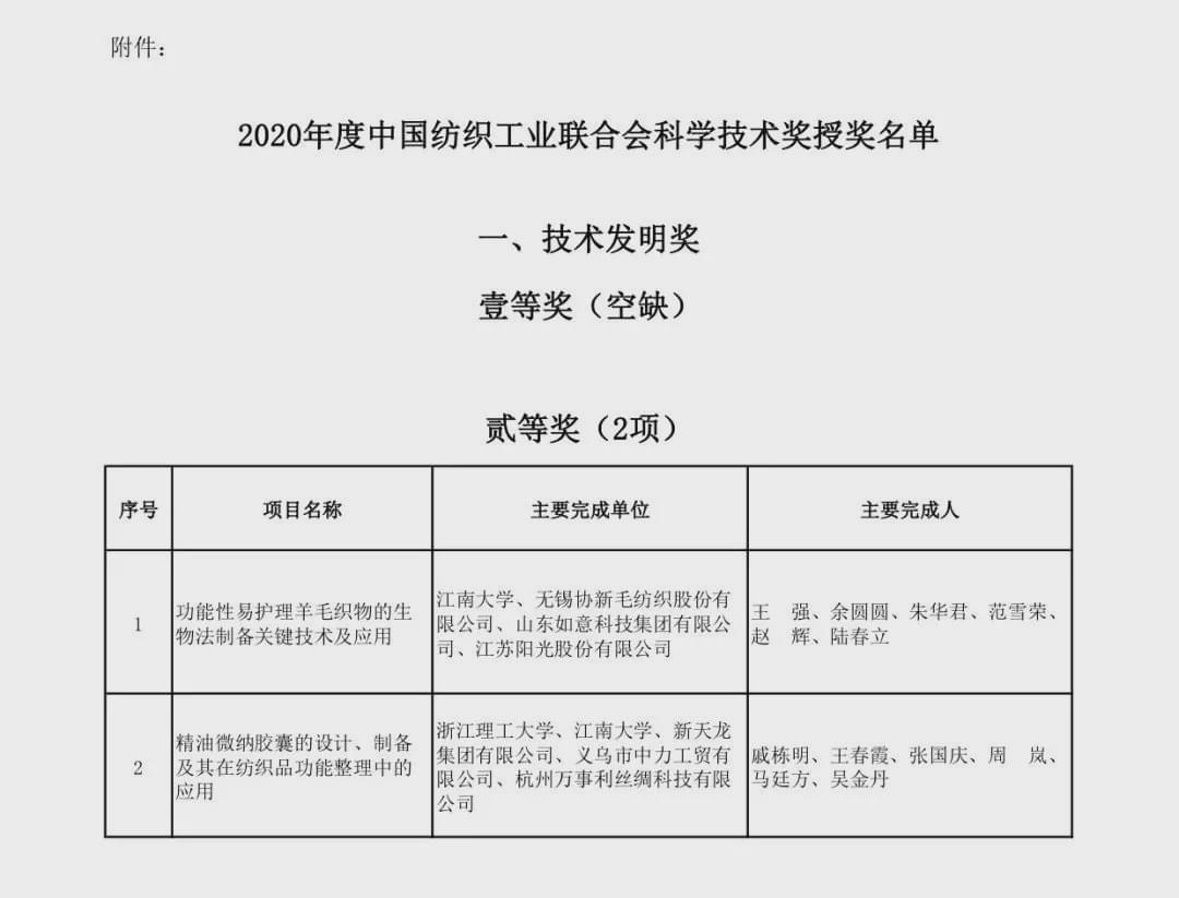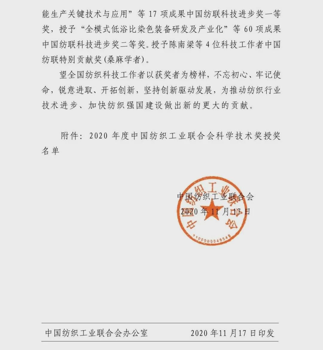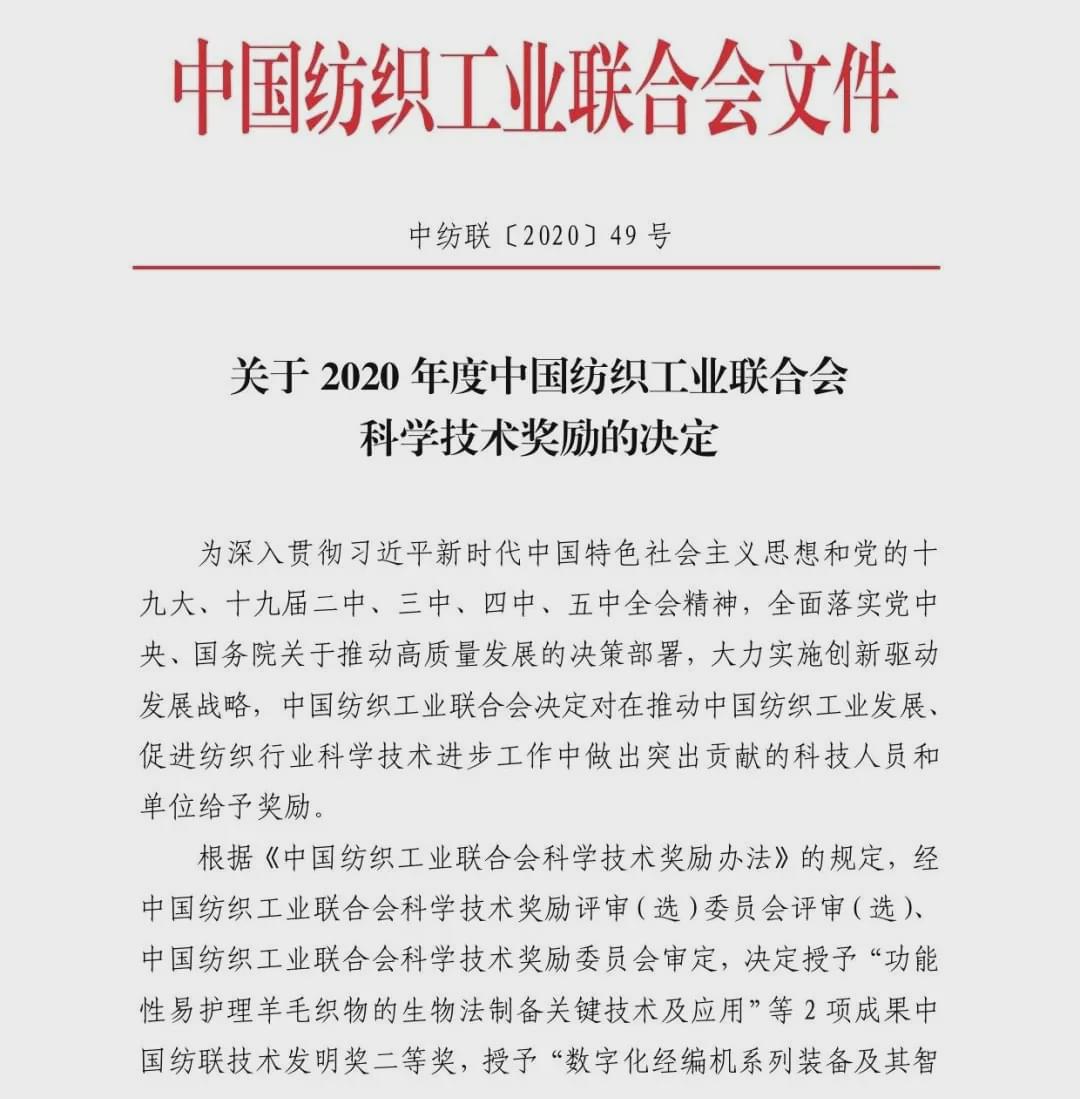 本刊記者-郝杰 12月22日,中國紡織工業聯合會隆重召開“紡織之光”2020年度中國紡織工業聯合會科技教育獎勵大會,發布并表彰“紡織之光2020年度中國紡織工業聯合會科學技術獎、教育獎、針織內衣創新貢獻獎。獲獎名單如下: “紡織之光”2020年度中國紡織工業聯合會科學技術獎