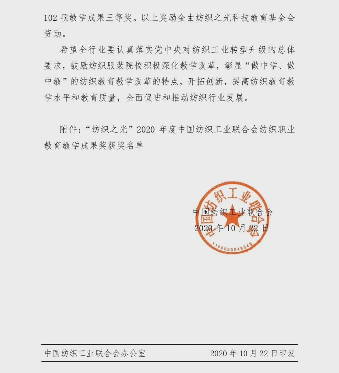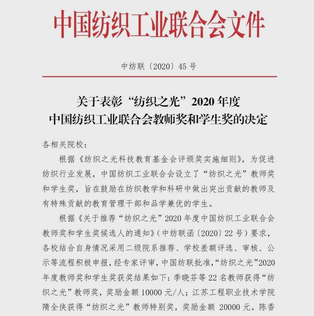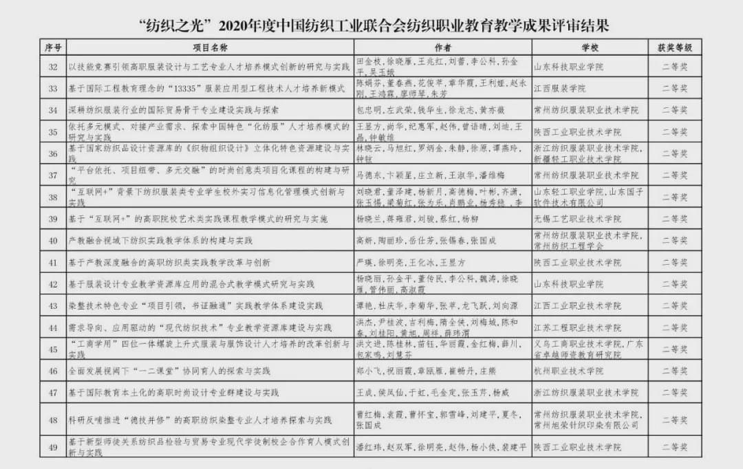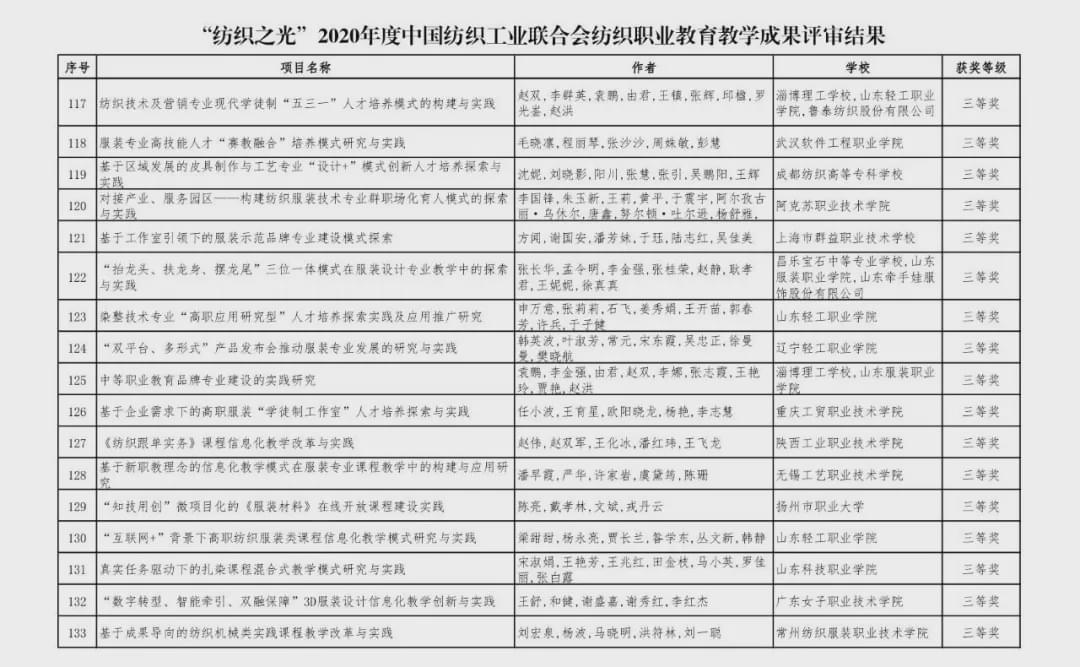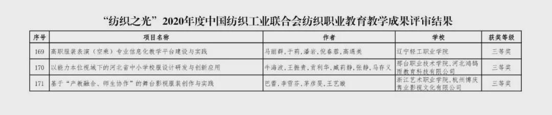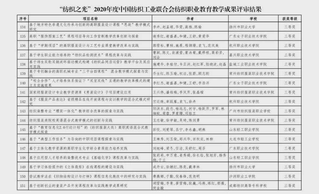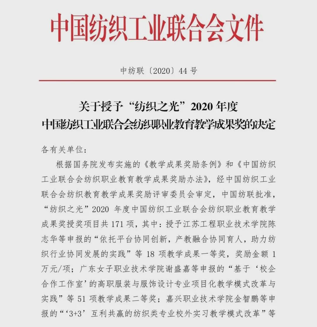 “紡織之光”2020 年度 中國紡織工業聯合會紡織職業教育教學成果獎