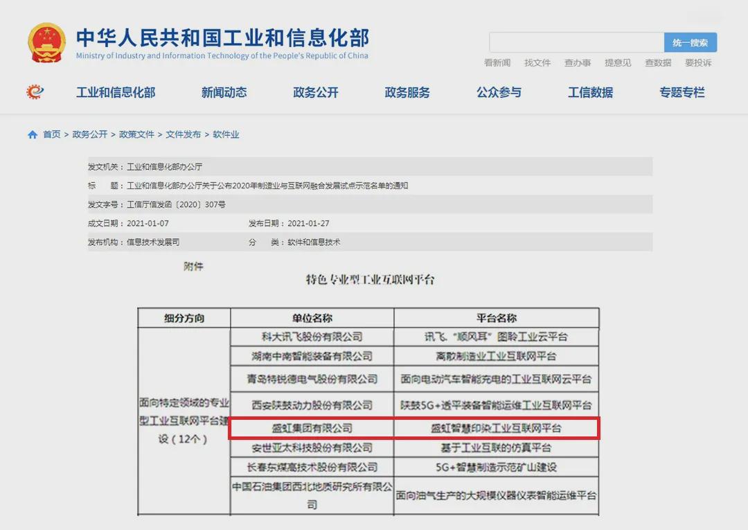 “盛虹智慧印染工業互聯網平臺”入選國家級榜單 近日,國家工信部公布了“2020年制造業與互聯網發展試點示范項目”,盛虹集團有限公司打造的 盛虹集團打造的行業內唯一一個國家級“工業互聯網平臺”搶占先機,通過IaaS、PaaS、SaaS三層建設及平臺功能開發推廣,實現對紡織印染全產業鏈的大數據分析與整合,目前入駐平臺的企業用戶已近2000個,正引領吳江乃至長三角區域紡織產業一次“數字化變革”。
