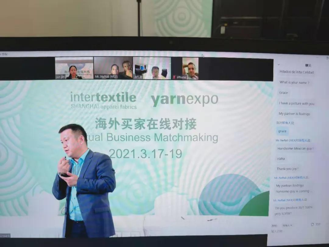 展會期間,賽得利公司、唐山三友集團、上海紡織等企業領導蒞臨展位與恒豐核心領導會談合作事宜,就創新材料、紡織科技如何為產品設計提供靈感及解決方案,開拓新品的經驗等展開深度交流。 ![]() 主辦單位在展會現場舉辦了海外買家線上見面會,恒豐集團進出口公司副總經理劉成吉代表集團,與來自泰國、墨西哥、巴基斯坦、巴西、印度等國家的客戶代表線上洽談。