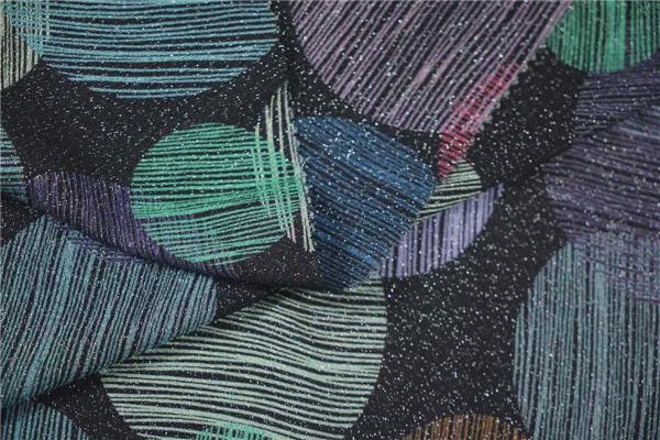 成分:粘膠63%,天絲31%,金銀絲6% 單位:深圳市佳多信紡織品有限公司 點評:融合超現(xiàn)實主義和迷幻電音風(fēng)格,線描感大比例圓形層疊交錯,采用雙面印花技術(shù),結(jié)合金銀絲的使用,呈現(xiàn)明暗對比的閃爍光澤,散發(fā)俏皮張揚的視覺感召力,營造前衛(wèi)美感,展示數(shù)字未來感的現(xiàn)代風(fēng)格。