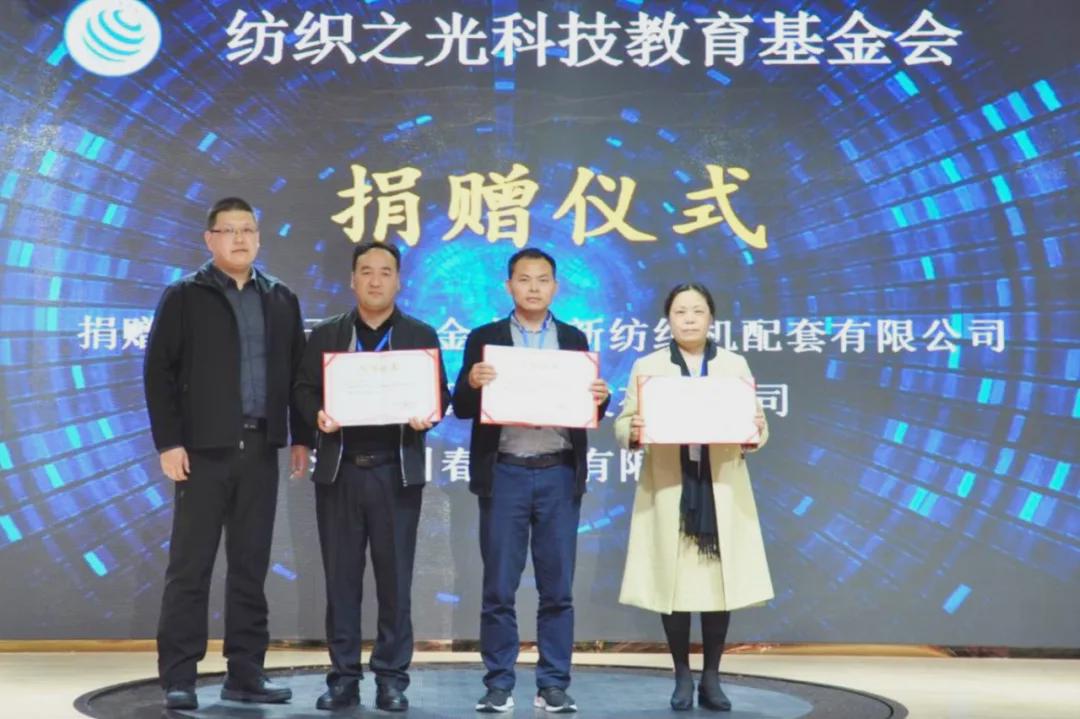 會上,紡織之光科技教育基金會向捐贈單位無錫市金太陽新紡織機配套有限公司、蘇州市四紡科技有限公司、引春機械浙江有限公司頒發了“紡織之光”捐贈證書。
