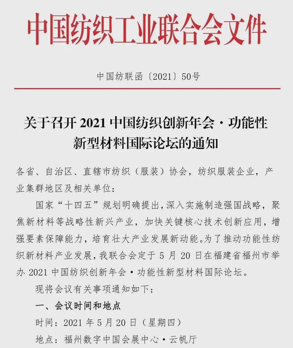 | 2021 中國紡織創新年會·功能性新型材料國際論壇將在福州召開! |