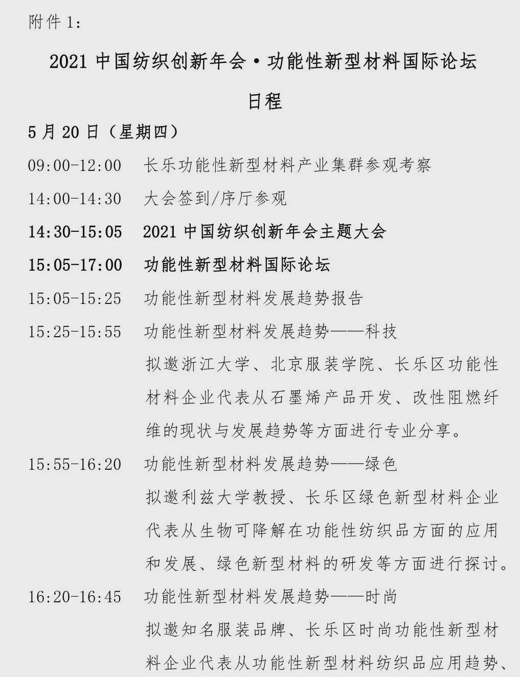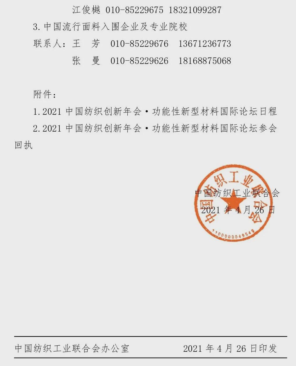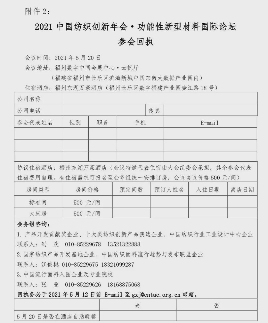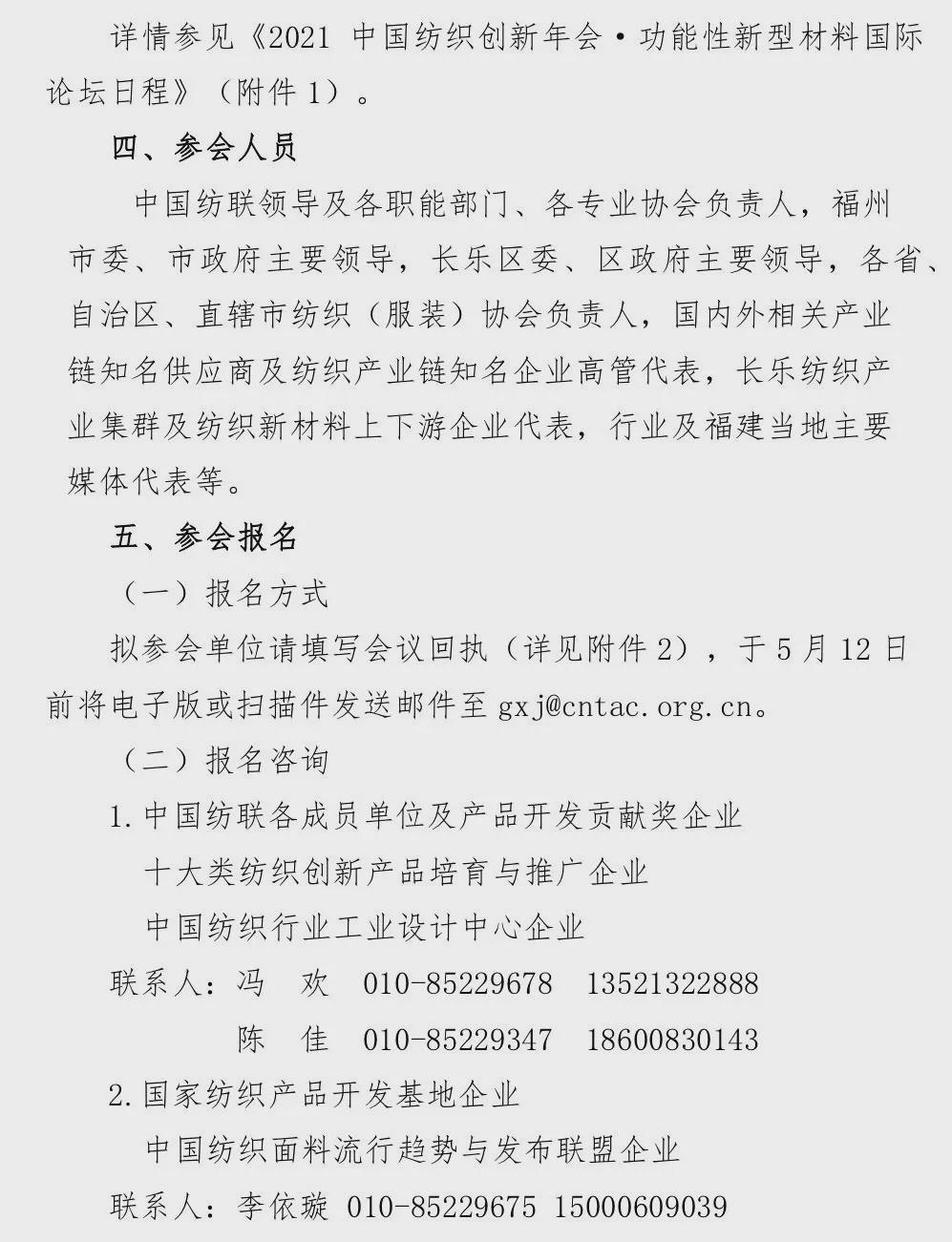 關于召開2021中國紡織創新年會·功能性新型材料國際論壇的通知 各省、自治區、直轄市紡織(服裝)協會,紡織服裝企業,產業集群地區及相關單位: 國家“十四五”規劃明確提出, 深入實施制造強國戰略,聚焦新材料等戰略性新興產業,加快關鍵核心技術創新應用,增強要素保障能力,培育壯大產業發展新動能。為了推動功能性紡織新材料產業發展,我聯合會定于5月20日在福建省福州市舉辦2021中國紡織創新年會·功能性新型材料國際論壇。 現將會議有關事項通知如下: 一、會議時間和地點 時間:2021年5月20日(星期四) 地點:福州數字中國會展中心·云帆廳 (福建省福州市長樂區濱海新城中國東南大數據產業園內) 二、組織機構 主辦單位: 中國紡織工業聯合會 福建省福州新區管理委員會 承辦單位: 福建省福州市長樂區人民政府 中國紡織信息中心 國家紡織產品開發中心 協辦單位: 恒申控股集團有限公司 三、會議主題及內容 (一)會議主題 新時代·新材料·新動能 (二)會議內容 1.領導致辭:特邀中國紡織工業聯合會、福州市人民政府相關領導出席峰會并致辭。 2.功能性新型材料國際論壇:特邀中國科學院院士等專家解讀功能性新型材料發展趨勢,并邀請國內外著名高校、產業鏈上下游知名企業從科技、時尚、綠色等方面探討功能性新型材料的發展趨勢。 3.參觀考察與簽約儀式:大會將邀請全體與會嘉賓參觀考察長樂功能性新型材料產業集群;會上將舉行功能性新型材料產業和相關項目合作簽約儀式。 詳情參見《2021中國紡織創新年會·功能性新型材料國際論壇日程》(附件1)。 四、參會人員 中國紡聯領導及各職能部門、各專業協會負責人,福州市委、市政府主要領導,長樂區委、區政府主要領導,各省、自治區、直轄市紡織(服裝)協會負責人,國內外相關產業鏈知名供應商及紡織產業鏈知名企業高管代表,長樂紡織產業集群及紡織新材料上下游企業代表,行業及福建當地主要媒體代表等。 五、參會報名 (一)報名方式 擬參會單位請填寫會議回執(詳見附件2),于5月12日前將電子版或掃描件發送郵件至gxj@cntac.org.cn。 (二)報名咨詢 1.中國紡聯各成員單位及產品開發貢獻獎企業 十大類紡織創新產品培育與推廣企業 中國紡織行業工業設計中心企業 聯系人:馮 歡 010-85229678 13521322888 陳 佳 010-85229347 18600830143 2.國家紡織產品開發基地企業 中國紡織面料流行趨勢與發布聯盟企業 聯系人:李依璇 010-85229675 15000609039 江俊樾 010-85229675 18321099287 3.中國流行面料入圍企業及專業院校 聯系人:王 芳 010-85229676 13671236773 張 曼 010-85229626 18168875068 附件: 1.2021中國紡織創新年會·功能性新型材料國際論壇日程 2.2021中國紡織創新年會·功能性新型材料國際論壇參會回執 中國紡織工業聯合會 2021年4月26日