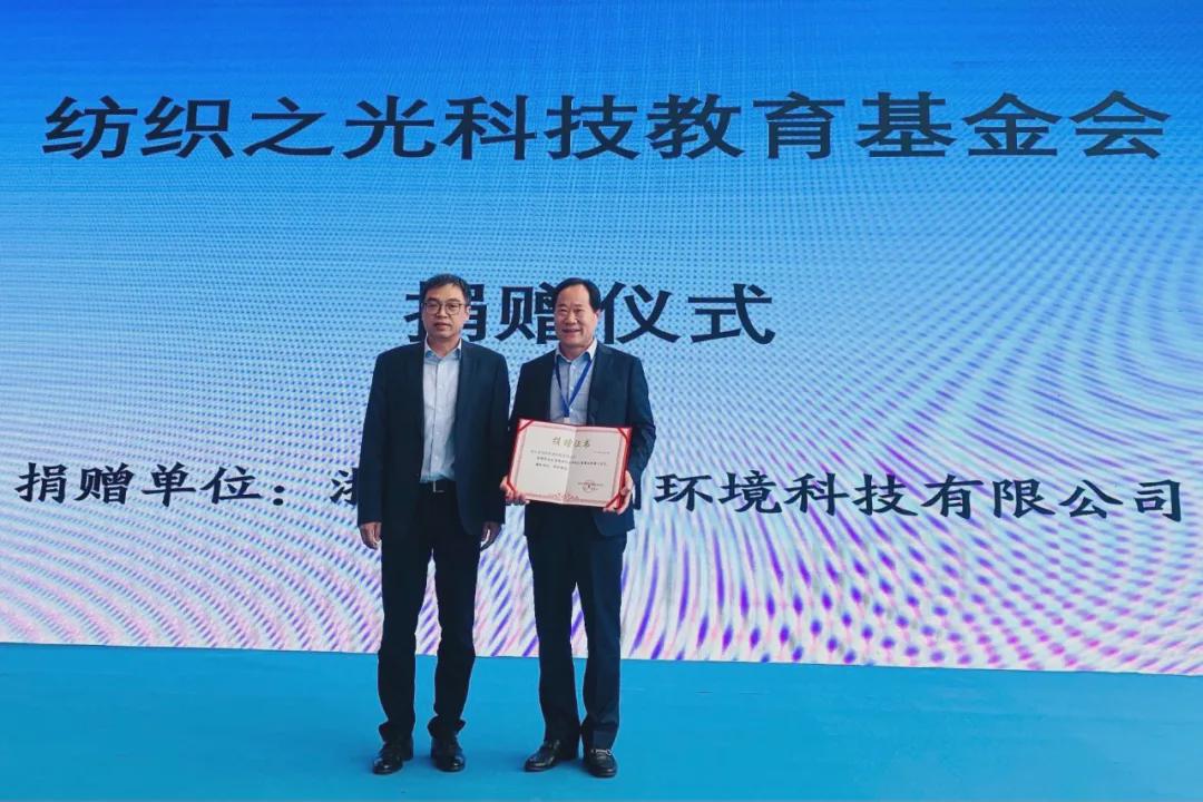 會上,紡織之光科技教育基金會向捐贈單位浙江金佰利環(huán)境科技有限公司頒發(fā)“紡織之光”捐贈證書。