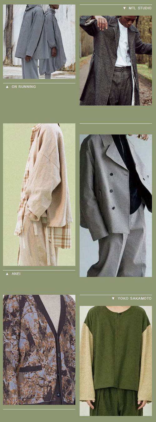 男裝休閑風(fēng)格結(jié)合農(nóng)耕文化和手工藝術(shù),日趨呈現(xiàn)原生質(zhì)感和自然審美,保持材質(zhì)本身及其在制造過程中產(chǎn)生的瑕疵感和裝飾風(fēng)格是設(shè)計的關(guān)鍵點(diǎn)。未經(jīng)雕琢的不完美質(zhì)感面料以棉結(jié)、麻節(jié)、顆粒等呈現(xiàn)原生肌理,結(jié)合柔軟舒適的觸感,賦予襯衫款式在外觀上返璞歸真的服用體驗(yàn);大地風(fēng)格的藝術(shù)化印花、提花紋樣升級服裝的浪漫基調(diào);硬挺的棉質(zhì)或麻質(zhì)厚布以素色、小花型或經(jīng)典人字紋呈現(xiàn),將自然風(fēng)格與都市休閑文化緊密融合,凸顯大衣、西裝、襯衫式夾克等款式的實(shí)用及多用化屬性;柔軟的彈性針織配以綠色、棕色等大地色調(diào),通過夾花、提花、迷彩等多樣紋理展現(xiàn)原生美感,制作開衫、馬甲等舒適款型,呼應(yīng)人們向往慢節(jié)奏生活的心理。