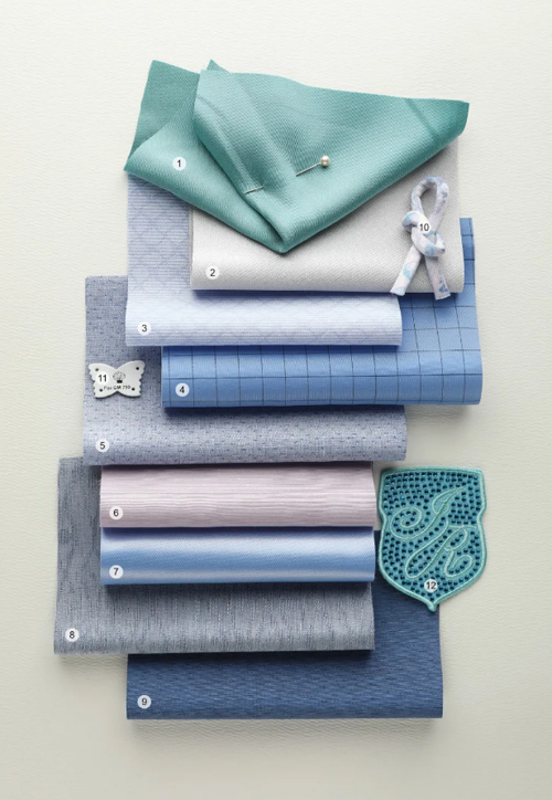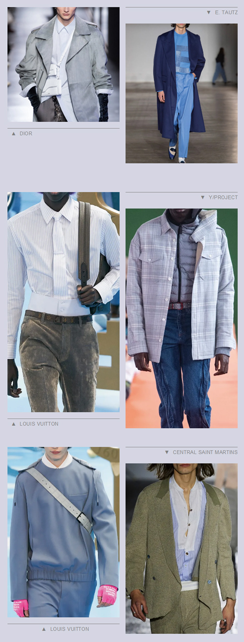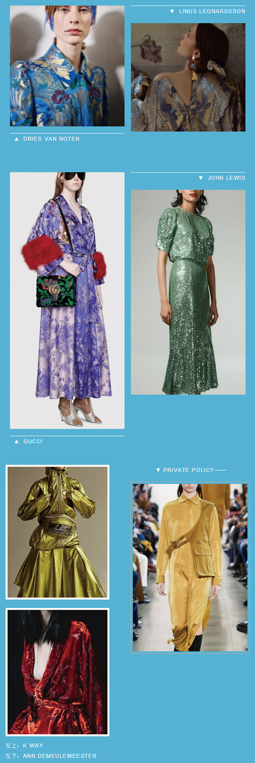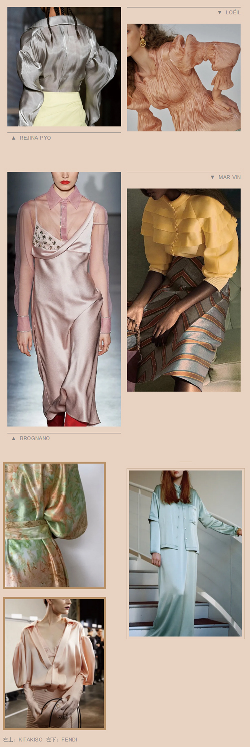 愈幻樂園 靈感與色彩 ![]() 樂觀、積極的精神樂園中,松弛自由的情緒和豐富的創(chuàng)造力構(gòu)建出一個更具內(nèi)在力量的嶄新世界。歡樂、感性的色彩渲染出純凈的浪漫格調(diào)。充滿歡愉意味的粉彩色帶出滿載元氣與活力的幸福觀感,明麗的青草綠、香蕉黃、落日紅等色彩活力十足;桃粉色和泡騰綠將精致優(yōu)雅和清透潔凈完美共融;為了滿足后疫情時代人們渴望療愈的情感訴求,宇宙藍紫、薄霧紫等色彩充分釋放治愈能量;星際藍強勢來襲,流光銀氣韻高雅。注重更具內(nèi)在力量的新世界被重新構(gòu)建,以打造純凈治愈的浪漫主義風格。 ![]() 服裝單品 & 材質(zhì)(女裝) 浪漫閨帷 ![]() 情緒自由喚醒初始理想,為秋冬女裝豐富高級優(yōu)雅的鮮活內(nèi)涵。明亮柔美的色彩配搭細膩、順滑的織物,將專屬春夏的浪漫加注于安逸的秋冬閨帷。絲滑靈動的醋酸纖維及真絲織物打破秋冬單品款式厚重的常規(guī),為睡衣式套裝、垂墜裙裝、女士襯衫裝點秀雅與輕巧韻味,更以優(yōu)異品質(zhì)帶出卓然質(zhì)感。色織真絲塔夫綢平滑挺闊,加入滌綸混紡后,不僅兼具抗皺、耐洗等易打理特性,更打造出備受市場青睞的高性價比之選。精巧的同色提花,數(shù)碼印花賦予織物外觀更多變化。織物經(jīng)環(huán)保染色呈現(xiàn)優(yōu)雅低調(diào)外觀的同時,更不乏肌理感。 ![]() 1 達利(中國)有限公司 2 上海宏創(chuàng)紡織品有限公司 3 紹興凱亨紡織品有限公司 4 海寧市天一紡織有限公司 5 杭州欣元印染有限公司 6 紹興舜佳紡織科技有限公司 7 吳江中迅紡織有限公司 8 紹興達亦紡織品有限公司 9,10 晉城市南希絲麻織造股份有限公司 11 森榮五金服飾有限公司 12 東莞市明嘉繩帶織造有限公司 13 石林服裝輔料商行 14 廣州展逸織造有限公司 服裝單品 & 材質(zhì)(男裝) 空 ![]() 運動元素滲透到都市通勤男裝領(lǐng)域,帶來令人眼前一亮的新日常風格。源自冷冽冬日晴空的色彩賦予面料獨特的清透與純凈,或搭配細小精致的幾何圖案,或采用微光澤紗線打造的不規(guī)則紋理,為男裝襯衫及休閑外套賦予更多睿智觀感。后疫情時代,健康、防護和高品質(zhì)已成為日常首選:新型染色工藝和PE膜的完美結(jié)合,使得面料具有良好的抗靜電效果和抗液體滲透功能;輕盈柔軟的高支高密面料結(jié)合吸濕、快干、抑菌等功能性,打造功能兼具品質(zhì)的貼身層款式。硬挺的織物質(zhì)感配以自然水洗效果和凹凸不平 ![]() 1 魏橋紡織股份有限公司 2 深圳市佳多信紡織品有限公司 3,5,8 魯泰紡織股份有限公司 4 蘇州梵諾紡織有限公司 6 紹興纖谷紡織有限公司 7 昆山俊邦紡織科技有限公司 9 嘉興市帝徽紡織有限公司 10 廣州榮建紡織品有限公司 11,12 利誠實業(yè)制造有限公司 智玩國度