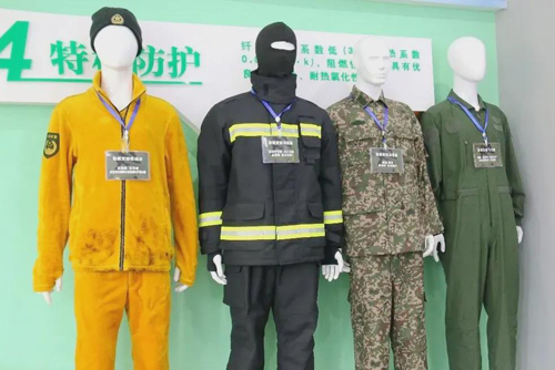 隨后,王士華帶領考察團參觀了企業產品展廳及聚酰亞胺纖維生產線,并詳細介紹了聚酰亞胺纖維的生產工藝及應用領域。奧神新材是全球首家采用干法紡生產聚酰亞胺的企業,創造性提出了“反應紡絲”制備纖維的新機理,創新并建立了聚合、紡絲、后處理的工藝與設備成套技術,開發了耐熱型、服用型和原液著色聚酰亞胺纖維生產技術,擁有“小批量、多品種、快響應、系列化”的柔性生產技術優勢。2016年,奧神新材聯合東華大學申報的“干法紡聚酰亞胺纖維制備關鍵技術及產業化”項目,榮獲國家科技進步二等獎。在產品展廳,高溫過濾氈、飛行員抗壓服、消防員滅火服、搶險救援服、各式防護頭套等甲綸Suplon?后道制品琳瑯滿目。