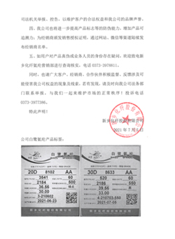 聲明表示,白鷺氨綸產地為河南新鄉,不存在任何生產分公司或委托代工廠。請廣大客戶從新鄉化纖氨綸營銷部或官方合作的經銷商購買白鷺氨綸產品,以免造成不必要的損失。對任何冒用、假借我公司名義進行不法生產經營的行為,將采取法律手段追究其侵權責任;如構成犯罪,將依法向司法機關舉報、控告,以維護客戶的合法權益和品牌聲譽。此外,也將進一步提高產品標志等的防偽能力,增加產品可追溯力;為經銷商頒發銷售授權證明,通過網站、微信等渠道陸續發布經銷商名單。同時,也請廣大客戶、經銷商、合作伙伴積極監督、反饋涉及可能侵害我公司權益的現象及線索。