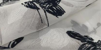 產品特點:將水墨花卉通過織造及植絨加工展現在面料實物上,面料質地輕薄、通透、防靜電,布面凹凸有質感,且具有環保屬性。