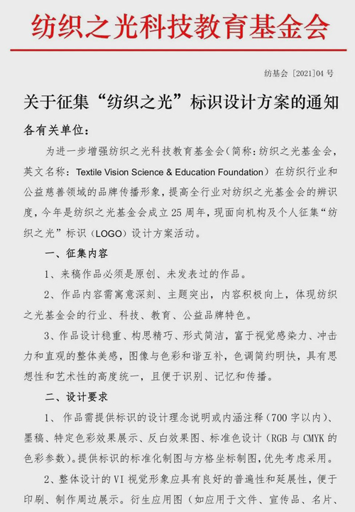 今年是紡織之光科技教育基金會成立 25 周年,為進一步增強基金會在紡織行業和公益慈善領域的品牌傳播形象,提高全行業對紡織之光科技教育基金會的辨識度,現面向機構及個人征集“紡織之光”標識(LOGO)設計方案。具體要求如下: