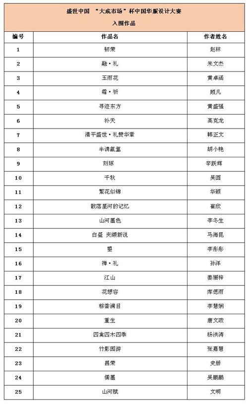 最終,經(jīng)盛世中國(guó)——“大成市場(chǎng)”杯中國(guó)華服設(shè)計(jì)大賽評(píng)審團(tuán)初選,25份入圍作品名單如下,現(xiàn)將入圍作品效果圖進(jìn)行公示。